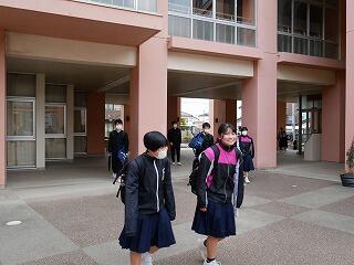 朝、3年生のいない校舎は寂しい感じがしました。ですが、1・2年生のホームベースでは、授業へ向かう生徒たちのいつもどおりの姿がありました。みんな元気です。