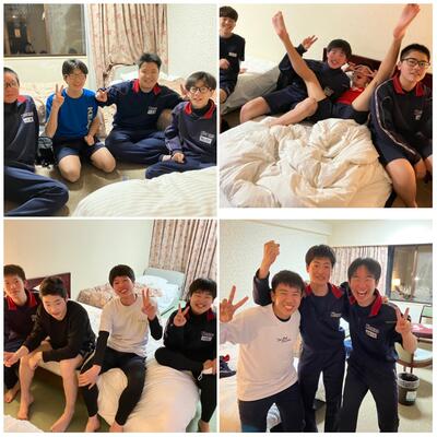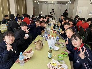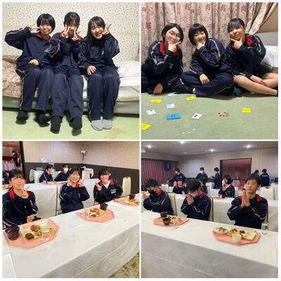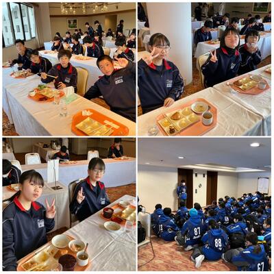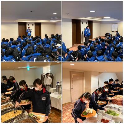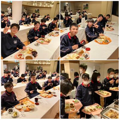 ホテルでの夕食。みんなで食べると自然に笑顔が出ます。ついつい取りすぎてしまいます。いっぱい食べて明日も頑張ろう!