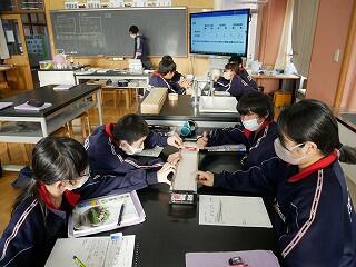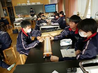 1年生の理科は音の伝わり方の学習です。弦の太さや長さ、強さを変えながらはじき、音の大きさや高さを記録していました。先生がまとめる場面では、生徒たちからたくさんの意見が出て、学びを深めていました。