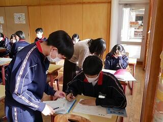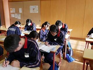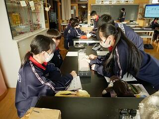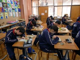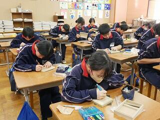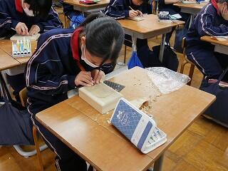 3年生の美術は、オリジナルの箱作り。表や側面を思い思いのデザインで彫り込んでいました。細かい作業なので、みんな集中して一心に彫っていました。中学生活の思い出の一品になるといいですね。