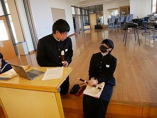 1年生の英語では、生徒が先生役として教える授業を取り入れています。今日は、班ごとに次の担当授業の構想を話し合い、準備を始めていました。どの班も2回目となる次の授業に向けて、先生から出されたテーマは、平均点が上がる授業です。この難しい課題達成のために、ALTからもアドバイスを受け、ミニテストやプリントなどを考えていました。