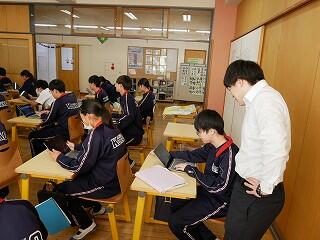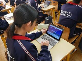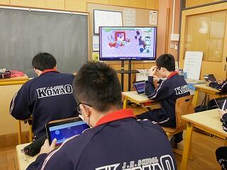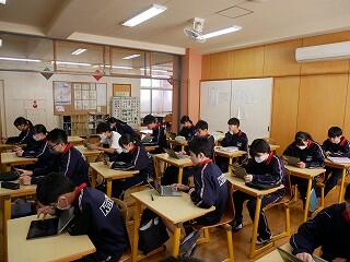 2年生の国語は、学期のまとめとして、生徒たちの作った問題を、生徒たちが答えるゲームで楽しんでいました。内容は、古典や文法、四字熟語など、全て四択の早押し問題です。解答の正確性や速さによってモンスターから逃げ切れるかどうかがゲームになっていました。みんな、すごい集中力です。