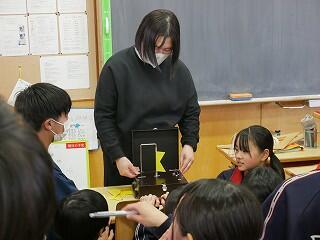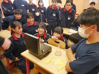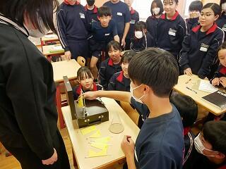 1年生の数学は、立体の体積を求める学習の導入です。平面の三角形や四角形を回転させると、どんな立体になるか実際に機械を使って確かめていました。スイッチを入れて、予想が当たると歓声が上がっていました。