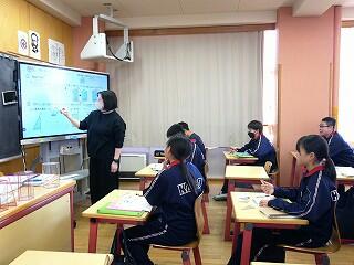 1年生の数学は、昨日と同じ内容の授業を別クラスで実施していました。参観したときはちょうど、機械を使って答えを確かめる前の段階で、自分で考え、近くの友達と学び合っているところでした。生徒たちの中に、考えたら伝え、互いに学び合うといった思考の流れができているように感じました。いい傾向です。