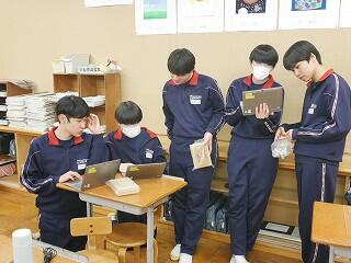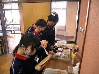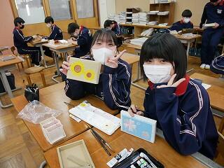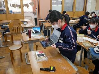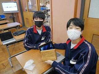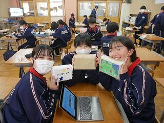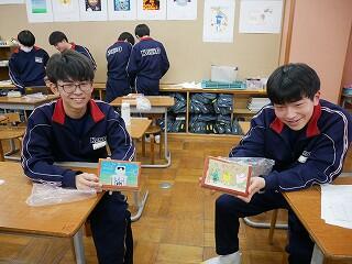 3年生の美術の「宝箱作り」は、ほとんどの生徒が完成していました。完成した作品は、写真に撮って説明を加え、観賞用アプリにアップロードして、互いの良い点を意見交換するなどしていました。思いの詰まった、世界に一つだけの宝箱の完成です。