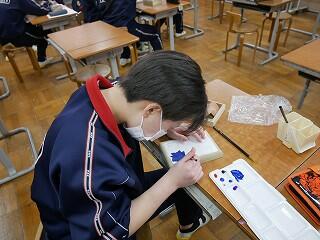 2年生の美術は、切り絵の制作です。見に行くと、2年生はみんな、微動だにせず、一心不乱にキャンバスに向き合っていました。すごい集中力です。