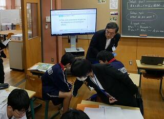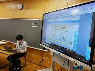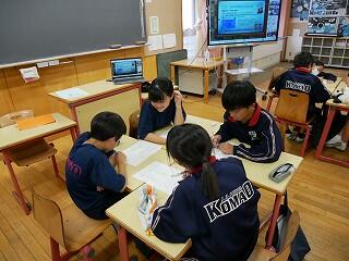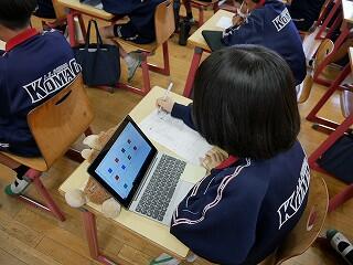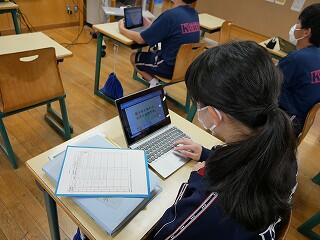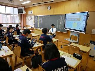 2年生の社会では、町を発展させるための工夫を話し合っていました。神戸市を例に、山を削って埋め立て地を作るなど大胆な案が紹介されました。各自が作成した計画案を、タブレットを使って共有していました。