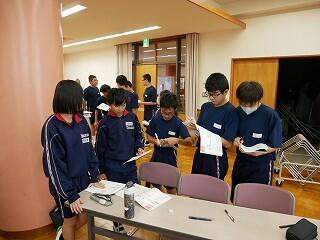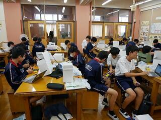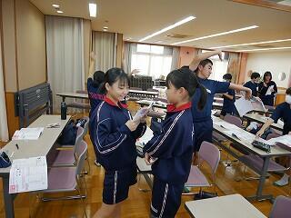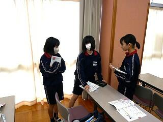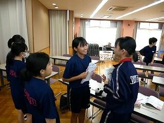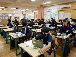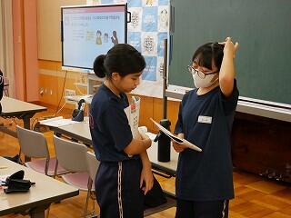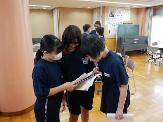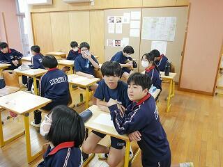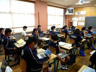 1年生の保健体育では、にぎやかな話合いを行っていました。内容は、SNSで知り合った人に他人の画像を送ってしまったときの問題点。多くの意見を集めるために3人以上の友達と意見交換するという課題を出され、生徒たちは次から次へとペアを替え、話合いをしては証拠となるメモをとっていました。楽しく学んでいました。