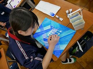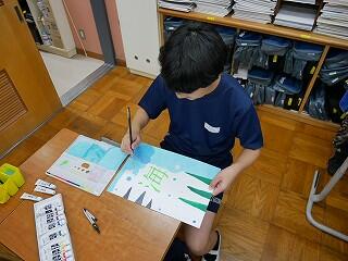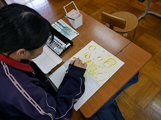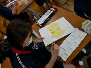 1年生の美術では、漢字の持つイメージをイラストにして着色していました。自分なりのイメージで表現した作品は、どれも面白くて魅力あるものに仕上がっていました。