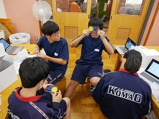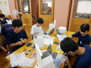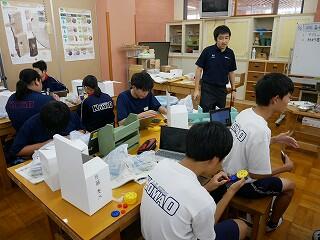 2年生の技術科をのぞいてみると、全員が夢中で作業に没頭していました。回転運動を伝達する仕組の授業で、模型の歯車の大きさや距離を替えると、エネルギーの伝わるスピードやパワーが変わることを学んでいました。何度も何度もパーツを替えながら一心不乱に試行錯誤していました。