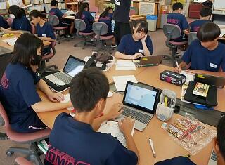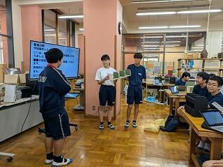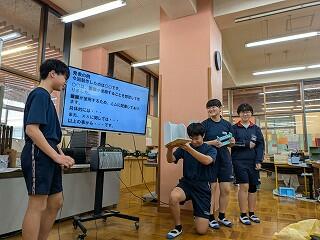 2年生の技術科では、自分たちが作った木工作品について自己評価を含めて解説していました。なかなか的を射た解説で、面白い発表もありました。