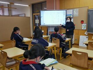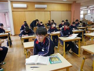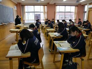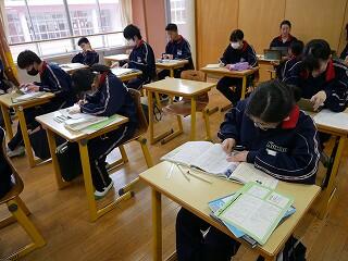 1年生国語は、1年間の学習のまとめを行っていました。スタディサプリで復習する生徒、ワークを使って学習する生徒、教科書や授業中に配付されたプリントを振り返る生徒など、それぞれが、自分に合わせた学習を選択していました。
