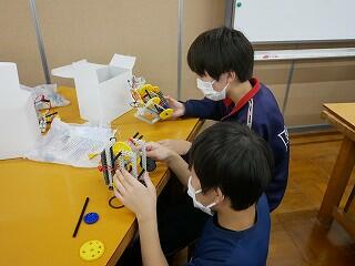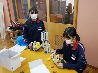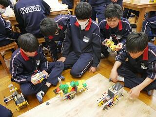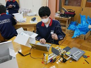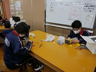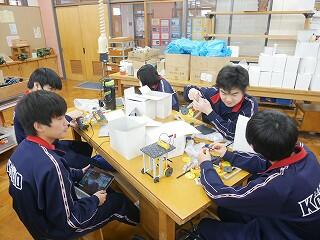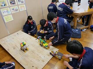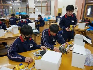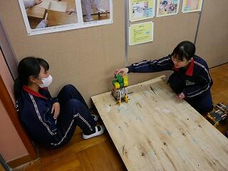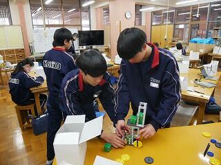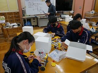2年生の技術科は、歯車を使った動力の学習で、模型作製を行っています。最初に作ったスピード重視の車の形を変形させて、今回は、より強いパワーを引き出す車にしていました。おもりをたくさん積んで坂道を上ることができる車の出現に、歓声が上がっていました。男子も女子も夢中で取り組んでいます。