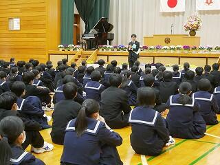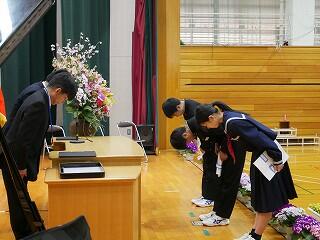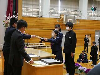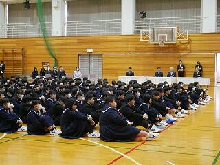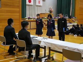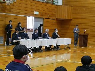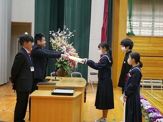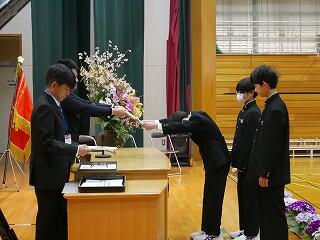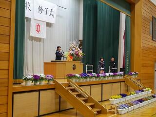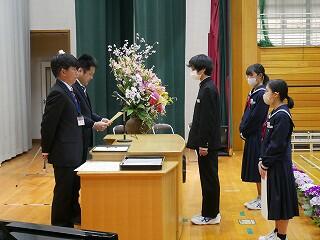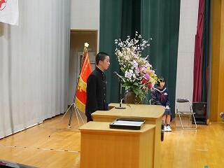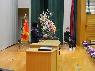 教育長の式辞、学校長あいさつ、生徒代表あいさつ、記念品贈呈が行われました。