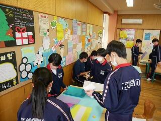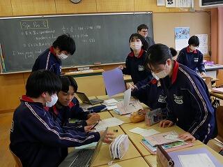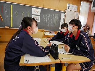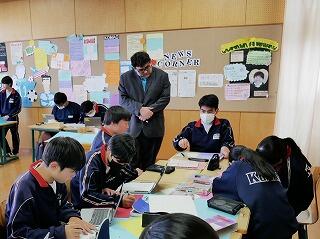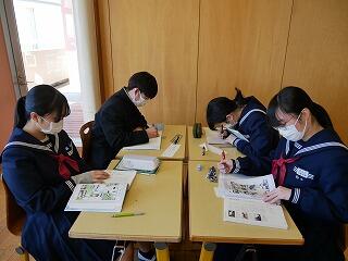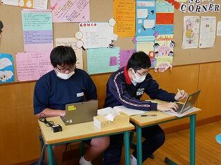 3年生の英語では、中学校3年間を振り返っての思い出を、英語で発表する企画が進行中です。英単語や英語での言い方を、辞書やタブレットで調べたり、教師やALTに質問したりしながら作成していました。どんな作品になるか、楽しみです。