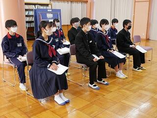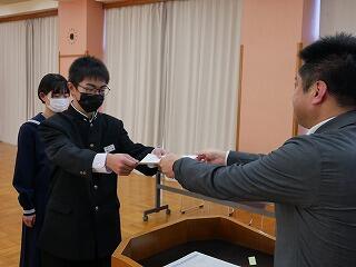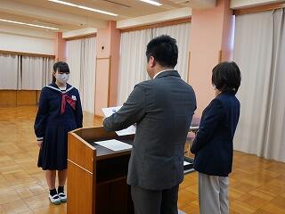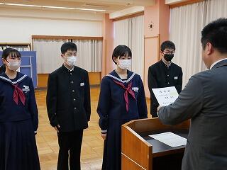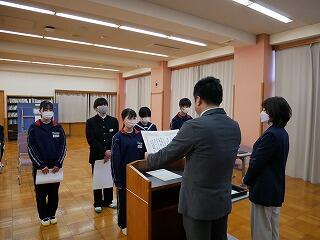 令和6年の生徒会役員任命式と、2学期から3学期にかけていただいた賞状の伝達式を行いました。張り詰めた空気の中、しっかりした態度で式が進行しました。役員の皆さん、生徒の代表として活動してください。表彰状を受けた皆さん、おめでとうございます。これをさらなる進歩につなげてください。