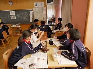 3年生の国語は、教科書の教材文を使った問題作りをしていました。全員が1人1問ずつ作り、全体で試験問題にするそうです。どこから出題しようか、選択肢にしようか、記述式にしようか、漢字の問題にしようかと、友達と相談しながら悩んでいました。出題者の気持ちになってみるのも、いい経験になっています。