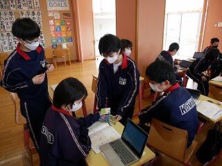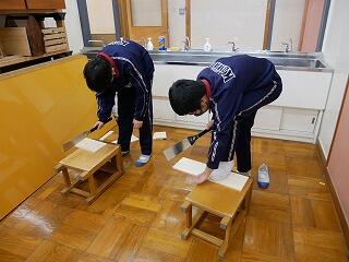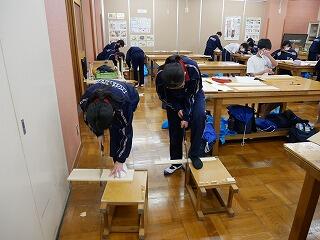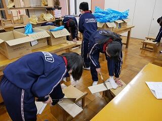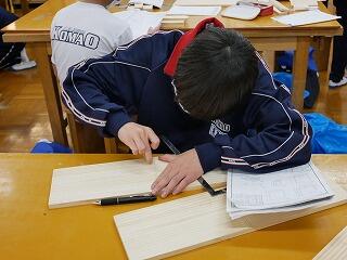 1年生の技術科、木工作品製作は、いよいよ木材の切断作業に入ってきました。曲がらないように、周囲の仲間が確認しながら進めていました。みんな慎重に丁寧に上手にのこぎりを使っていました。