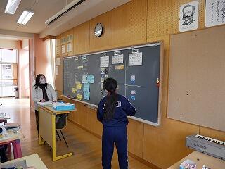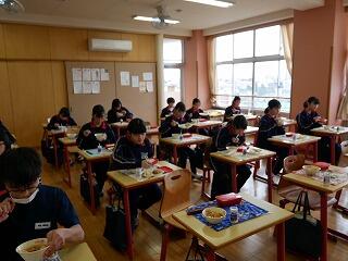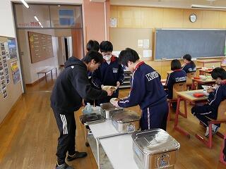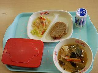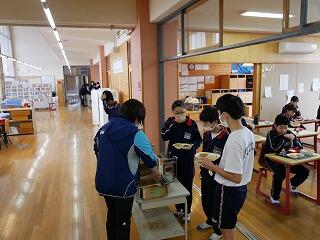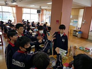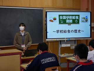 今日の給食のメインはハンバーグ。1年生ではお代わりジャンケンが白熱していました。食べ始まると、栄養教諭から給食の歴史について解説がありました。