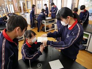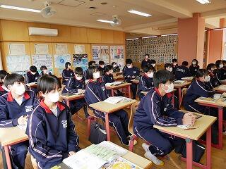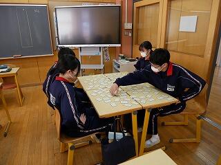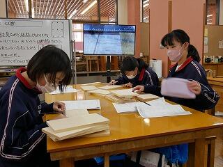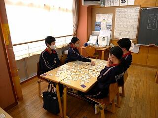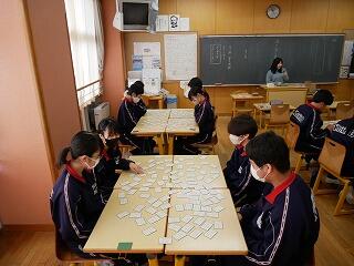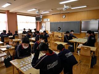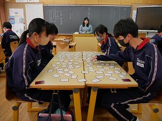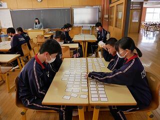 古典の学習の一環として、2年生でも百人一首カルタ取りを行っていました。先生が読み上げる和歌の下の句を、仮名遣いに注意しながら誰よりも早く取ろうと盛り上がっていました。