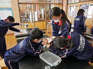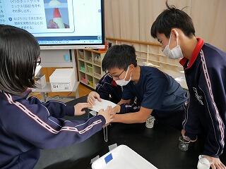 1年生の理科は、火山のでき方を再現する実験をしていました。マグマの粘り気によって、できる火山の形の違いを、小麦粉を注射器で押し出すことで再現していました。みんなで力を合わせて、「せーの」と楽しそうでした。
