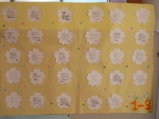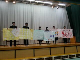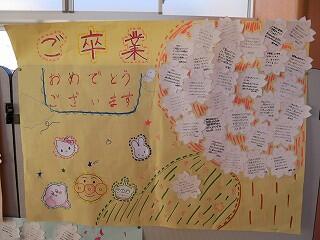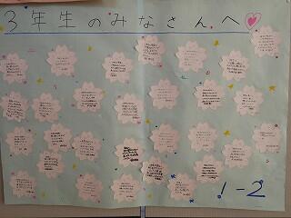 昨日の3年生を送る会で、1・2年生の各クラスから贈ったメーセージです。一人一人がカードに心を込めて書いていました。