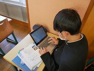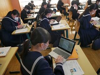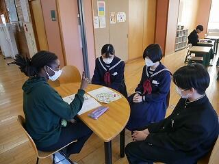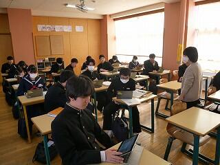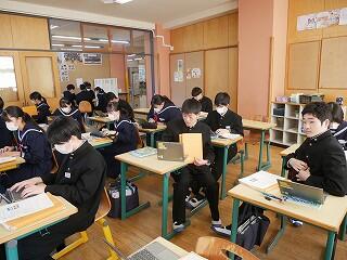2年生の英語は、タブレットを使って、班ごとに英語でのメールのやり取りをしていました。その間、順番にALTとの会話もしていました。今日は教科書のイラストを使った道案内です。ちょっと緊張気味に、全員がALTの先生と話していました。