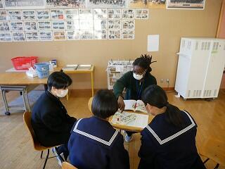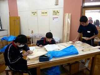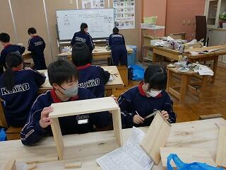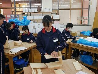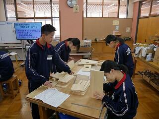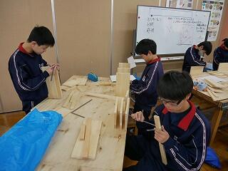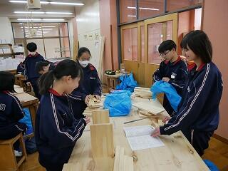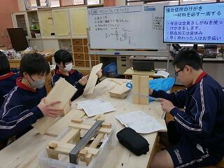 1年生の技術科は、木工作品製作の大詰め。切った板を組み合わせて、完成する作品の確認です。板の寸法を測ったり、友達におさえてもらったりしていました。設計図のとおりにできあがるか、楽しみです。